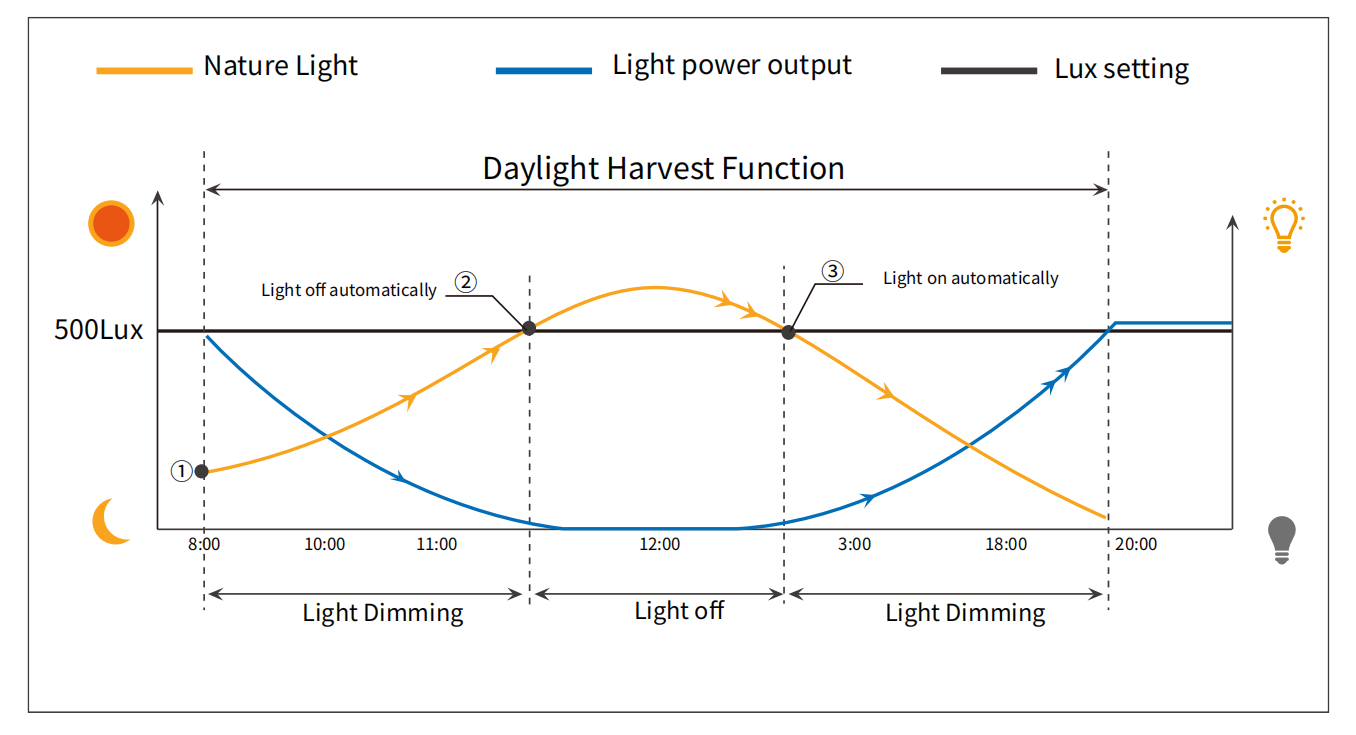 အာရုံခံကိရိယာသည်သဘာဝအလင်းရောင်ကိုရှာဖွေတွေ့ရှိသောအခါ၎င်းသည်အလင်းကိုမှေးမှိန်သွားလိမ့်မည်။ အလင်းကရိယာသည်အောက်ပါအတိုင်း output ကို dimming ဖြစ်သည်။
