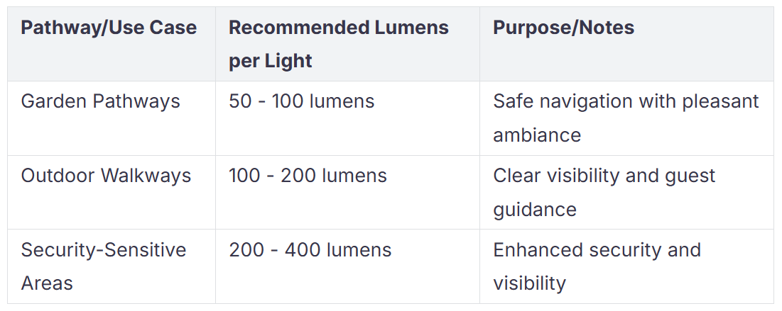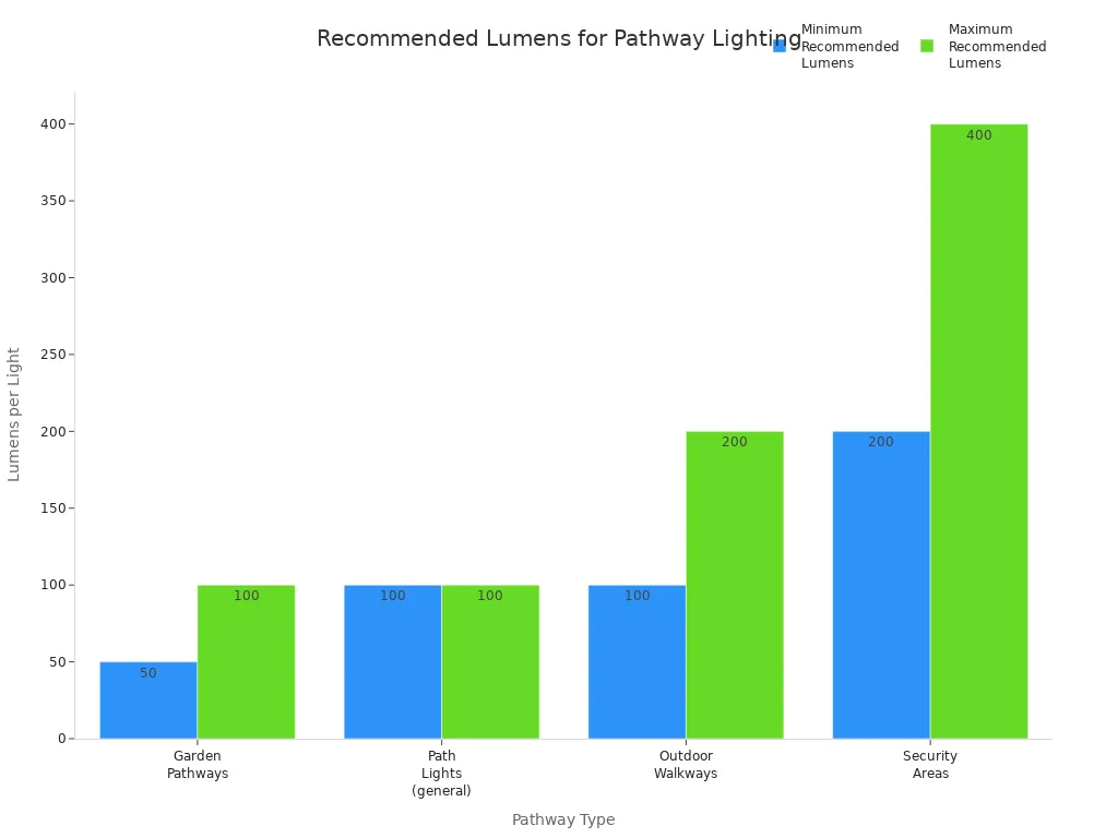 လုံခြုံစိတ်ချရသောလမ်းကြောင်းများရှိရန်အရေးကြီးသည်။ လမ်းကြောင်းအလင်းရောင်သည်မည်သည့်နေရာတွင်လမ်းလျှောက်ရမည်ကိုကြည့်ရှုရန်ကူညီသည်။ ၎င်းသည်ခရီးစဉ်များနှင့်ရေတံခွန်ကိုလည်းရပ်တန့်စေသည်။ ဥယျာဉ်လမ်းကြောင်းများအတွက်, Lumens 50-100 နှင့်အတူအလင်းအိမ်ကိုသုံးပါ။ Lookways သည်အလင်းရောင်အတွက် 100 မှ 200 Lumens လိုအပ်သည်။ သင်လုံခြုံရေးပိုလိုချင်ရင်အလင်းတစ်ခုစီအတွက် Lumens 200-400 ကိုသုံးပါ။ အလင်းရောင်အတွက် 6-8 ပေဆိတ်ကွယ်ရာပြင်ပ LED မီးထွန်းထား၏။ ကျဉ်းမြောင်းသောလမ်းကြောင်းများပိုမိုနီးကပ်စွာအလင်းများလိုအပ်သည်။ ကျယ်ပြန့်လမ်းကြောင်းများမှာဆိတ်ကွယ်ရာအလင်းအိမ်ရှိနိုင်သည်။ မြေပြင်အထက် 14 လက်မခန့်ရှိသောမီးများကိုထားပါ။ ၎င်းသည်တိုက်ရိုက်ရောင်ခြည်ကိုပေးသည်။ လမ်းကြောင်းကိုကောင်းမွန်စေသည်။