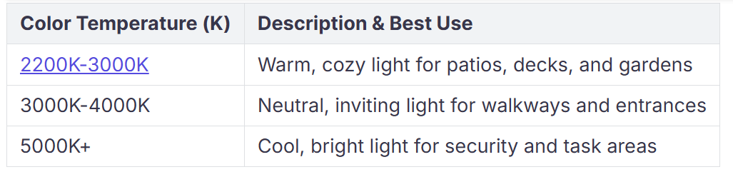 မှန်ကန်သောအရောင်အပူချိန်ကိုကောက်ယူခြင်းသင်၏နေရာသည်သင်၏နေရာကိုမည်သို့ခံစားရမည်ကိုပြောင်းလဲစေသည်။ နွေးထွေးသောအလင်းသည် 2200k မှ 3000 ကျပ်အထိပြုလုပ်သောနေရာများသည်ပျူငှါနွေးထွေးမှုနှင့်ကြိုဆိုခြင်းကိုပြုလုပ်သည်။ သင်အနားယူလိုသောသို့မဟုတ်သူငယ်ချင်းများနှင့်ပျော်စရာကောင်းလိုသော Patios, Decks သို့မဟုတ် Gardens အတွက်ဤအရာကိုသုံးပါ။ ကြားနေအဖြူ, 3000k နှင့် 4000K အကြားရှင်းလင်းပြတ်သားသောအလင်းကိုပေးသည်။ ဤအရာသည်လမ်းလျှောက်ခြင်းနှင့် 0 င်ခွင့်များအတွက်ကောင်း၏။ အေးမြသောအဖြူ, 5000k အထက်တွင်အလွန်တောက်ပ။ ချွန်ထက်သည်။ အရာရာကိုရှင်းရှင်းလင်းလင်းမြင်ရန်လိုအပ်သည့်လုံခြုံရေးအလင်းရောင်သို့မဟုတ်အစက်အပြောက်များအတွက်၎င်းကိုအသုံးပြုပါ။