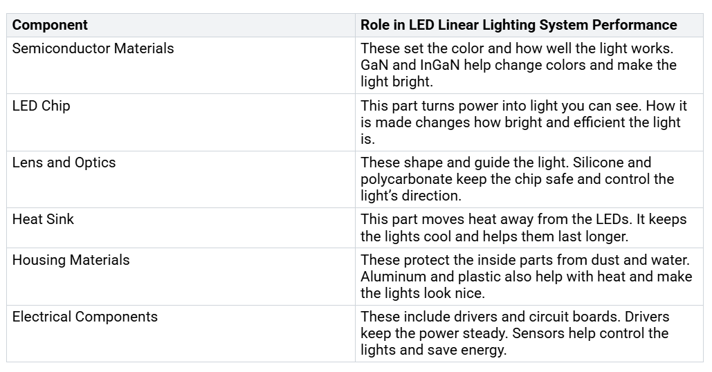 Lead Linear Lighting သည်ကြီးမားသောနေရာများတွင်တောက်ပသောအလင်းများပေးရန်အထူးအစိတ်အပိုင်းများကိုအသုံးပြုသည်။ အပိုင်းတိုင်းသည်အလင်းအိမ်ကောင်းကောင်းအလုပ်လုပ်သည်။ အပေြာင်းအောက်ပါဇယားသည်အဓိကအပိုင်းများကိုပြသသည်။
