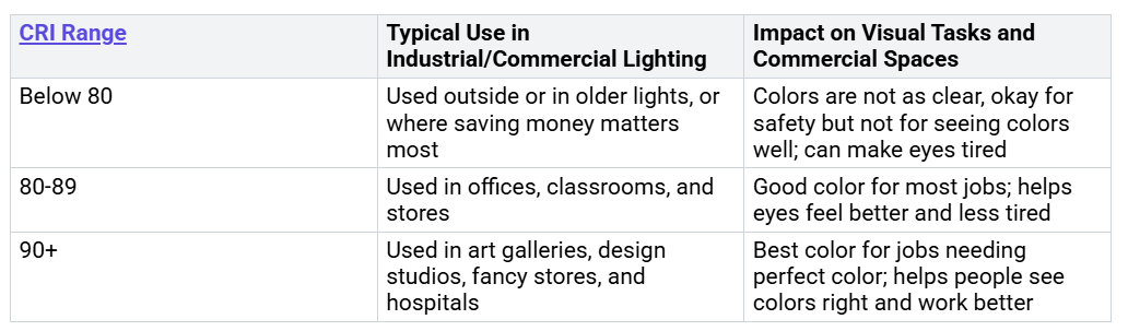 ရှည်လျားသောပါးလွှာသော fixtures အတွက် LEDsအလင်းကိုပေးရန်ကူညီပါ။ ၎င်းသည်သင်၏မျက်လုံးများကိုပိုမိုလွယ်ကူစေပြီးပိုမိုကောင်းမွန်လာစေရန်ကူညီသည်။ စီးပွားရေးလုပ်ငန်းများတွင်အရောင်တိကျမှုသည်အရေးကြီးသည်။ စက်မှု linear lighting များသောအားဖြင့်တစ် ဦး ရှိပါတယ်80 နှင့် 90 အကြား crib. 80 သို့မဟုတ်ထိုထက်ပိုသော CRI သည်အလုပ်အများစုအတွက်ကောင်းသည်။ 90 သို့မဟုတ်ထိုထက်ပိုသော CRI သည်အရောင်အတိအကျရှိရမည်နေရာများအတွက်အကောင်းဆုံးဖြစ်သည်။ ပိုမိုမြင့်မားသော CRI ဆိုသည်မှာပိုမိုကောင်းမွန်သောအရောင်, နှစ်သိမ့်မှုနှင့်ပိုမိုလုံခြုံစိတ်ချရသောအလုပ်ကိုဆိုလိုသည်။ ဒါကလူတွေကိုသူတို့ရဲ့အလုပ်တွေကိုပိုကောင်းအောင်ကူညီပေးတယ်။