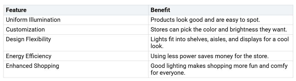 စတိုးဆိုင်များသည်ထုတ်ကုန်များကိုပြသရန်အတွက် linear lighting ကိုအသုံးပြုသည်။ တောက်ပသောအလင်းရောင်ပင်လျှင်ဖောက်သည်များကိုရှင်းရှင်းလင်းလင်းမြင်ရန်ကူညီပေးသည်။ အမှောင်အစက်အပြောက်များသို့မဟုတ်ကြမ်းတမ်းသောအရိပ်များမရှိပါ။ အပေြာင်းအောက်ပါဇယားသည် linear lighting သည်စတိုးဆိုင်များကိုမည်သို့ကူညီပေးသည်ကိုပြသသည်။